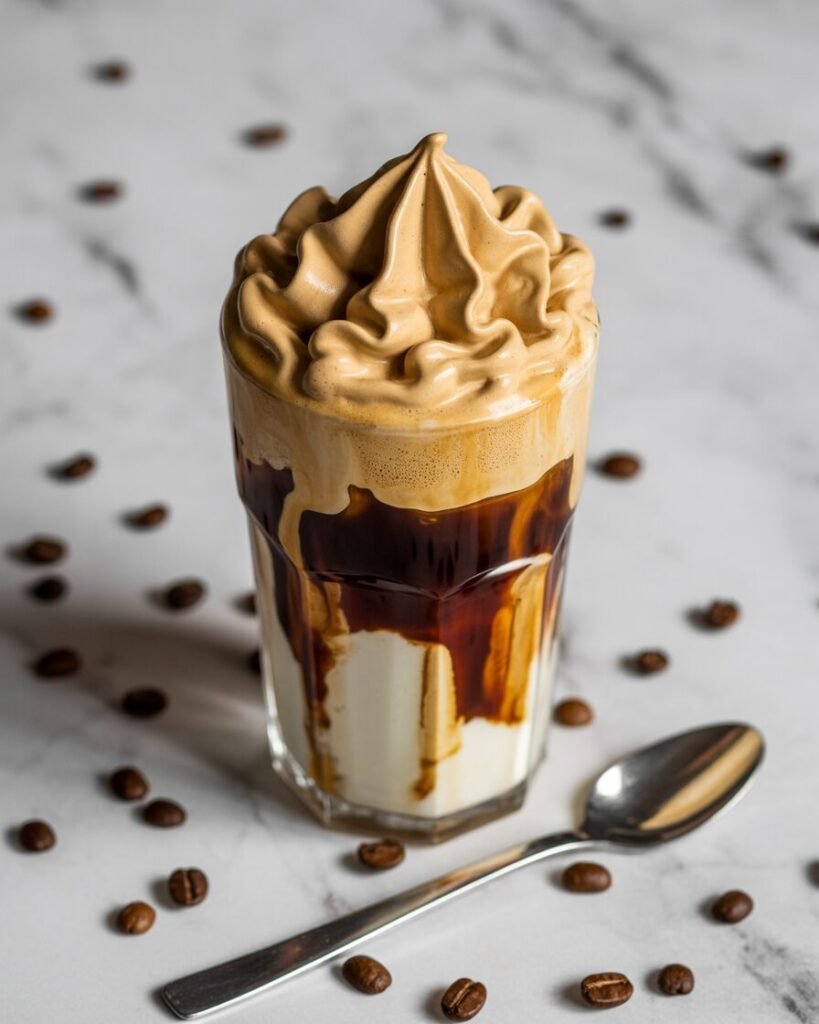 The whipped coffee itself is made by beating equal parts instant coffee, sugar, and hot water until it forms stiff peaks. It’s weirdly meditative to make, and the result is this light, fluffy, intensely coffee-flavored cloud. Layer it over vanilla ice cream, pour cold brew around it, and you’ve got yourself a dessert that doubles as an afternoon pick-me-up.