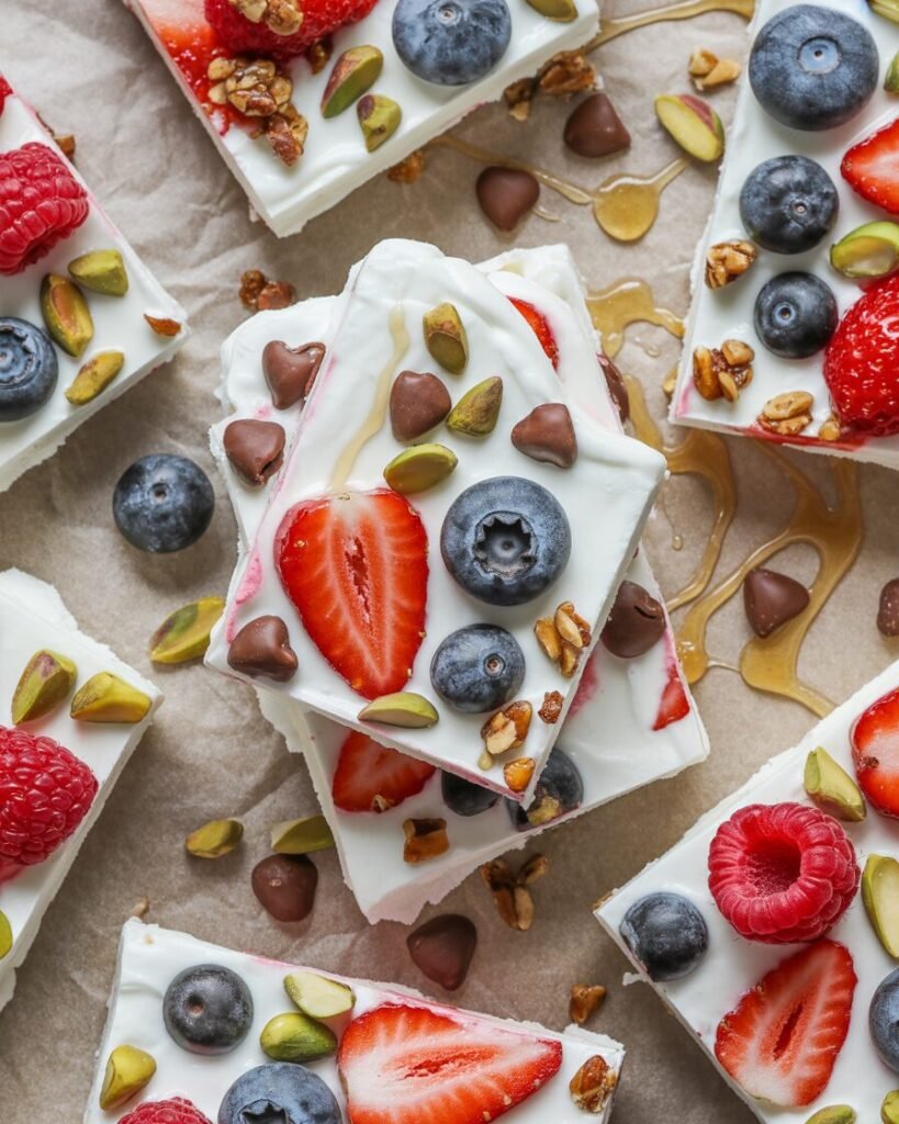The key to success is using full-fat Greek yogurt so it doesn’t get icy, and spreading it thick enough (about half an inch) so it doesn’t shatter when you break it. I also like to swirl in a little honey or maple syrup because unsweetened yogurt can be pretty tart.