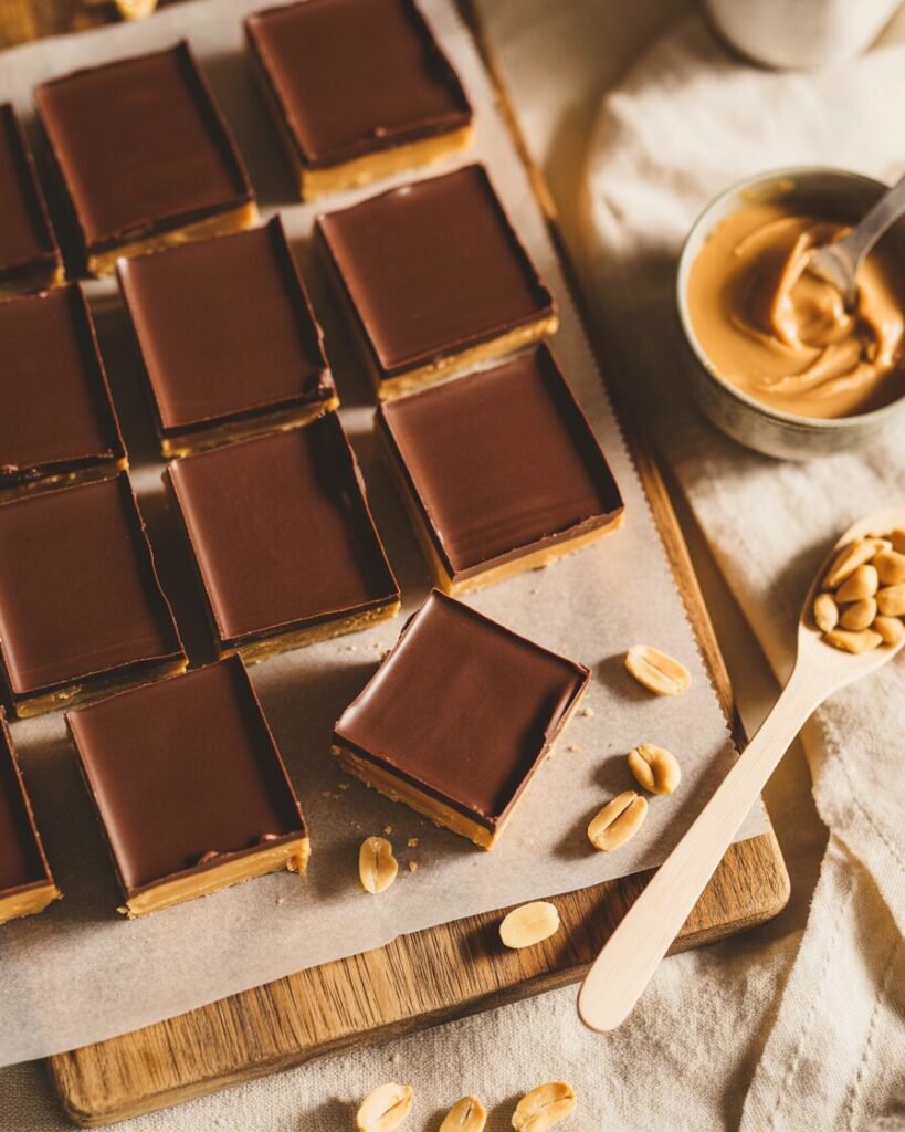 Mix peanut butter, powdered sugar, and melted butter until it forms a thick dough. Press it into a parchment-lined pan. Melt the chocolate chips and spread them over the top. Refrigerate until set, then cut into bars. Store them in the fridge because they get soft at room temperature — which, in summer, is basically melted.