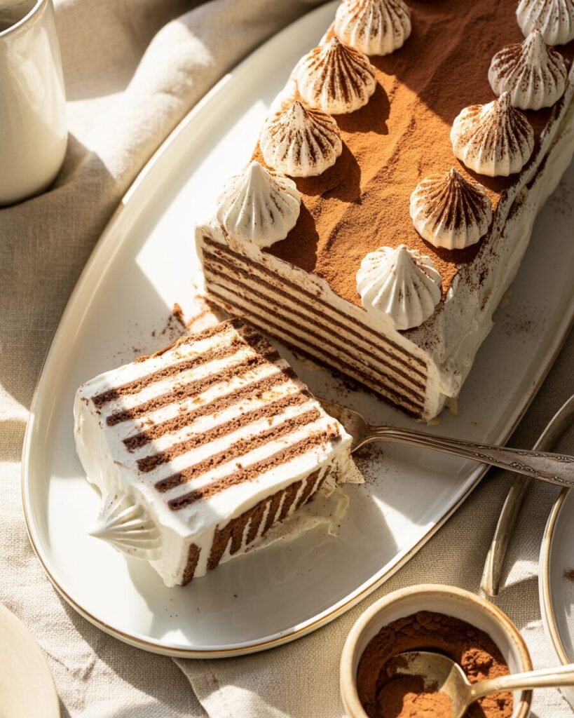 Whip the cream with powdered sugar and vanilla until stiff peaks form. Layer cookies and whipped cream alternately in a loaf pan or rectangular dish. Cover and refrigerate overnight. The cookies absorb the cream and turn into a soft, cake-like texture — it genuinely feels like cheating, it’s so easy. 🙂