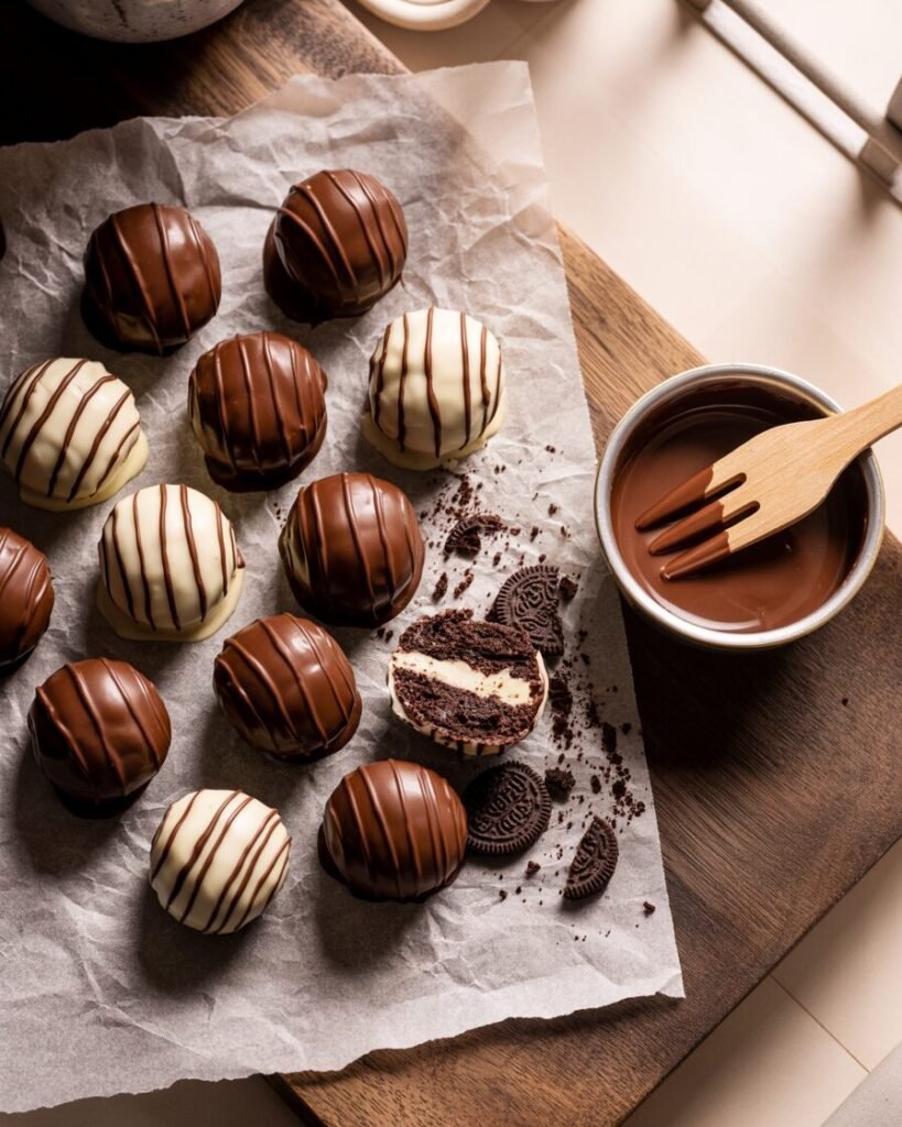 Crush the Oreos into fine crumbs in a food processor. Mix with softened cream cheese until combined. Roll into balls and freeze for 15 minutes. Dip in melted chocolate, let set on parchment, and you’re done. FYI, these disappear within minutes at any party — make a double batch.