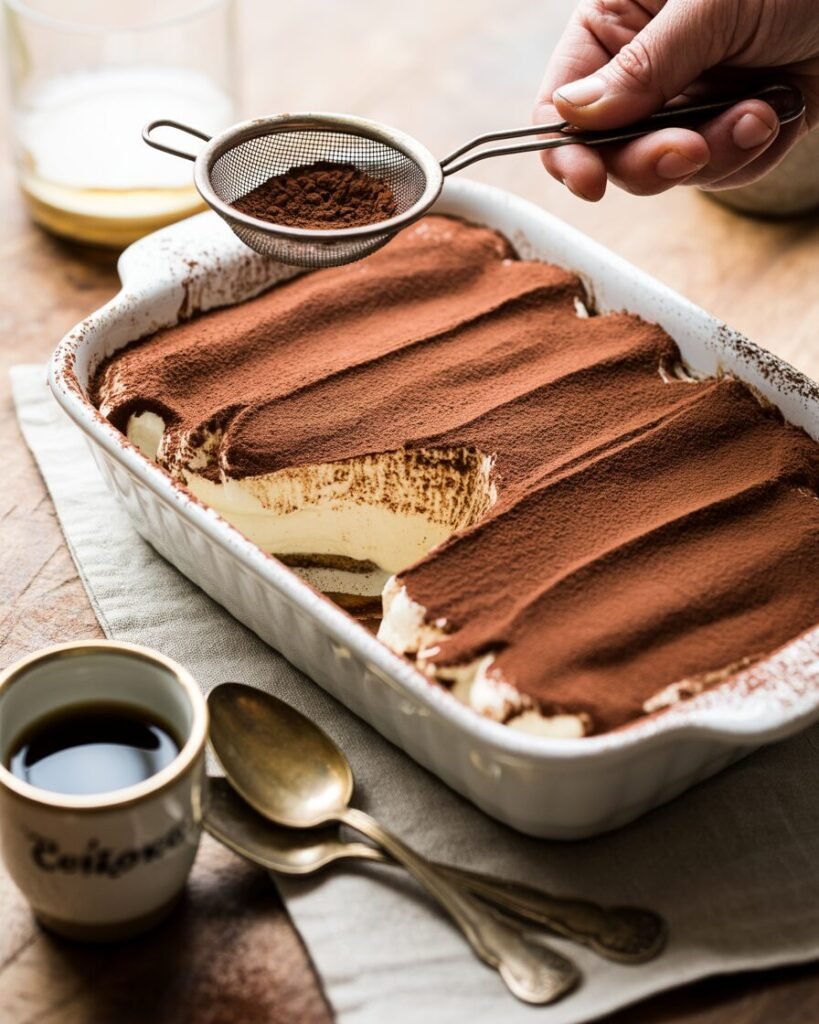 Whip mascarpone with cream and sugar until smooth and thick. Quickly dip each ladyfinger in espresso (don’t soak them — soggy tiramisu is a real problem :/) and layer them in a dish. Spread the mascarpone cream on top, then repeat the layers. Dust generously with cocoa powder and refrigerate overnight. The longer it sits, the more the flavors meld together.