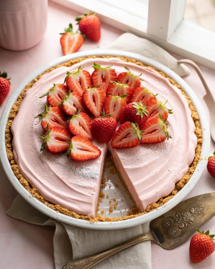 Blend half the strawberries into a smooth purée. Beat cream cheese with condensed milk and lemon juice, then fold in the strawberry purée. Pour into the crust and freeze for about four hours. Let it sit at room temperature for 10 minutes before slicing — frozen pies need that rest to cut cleanly. Top with fresh strawberries and whipped cream.