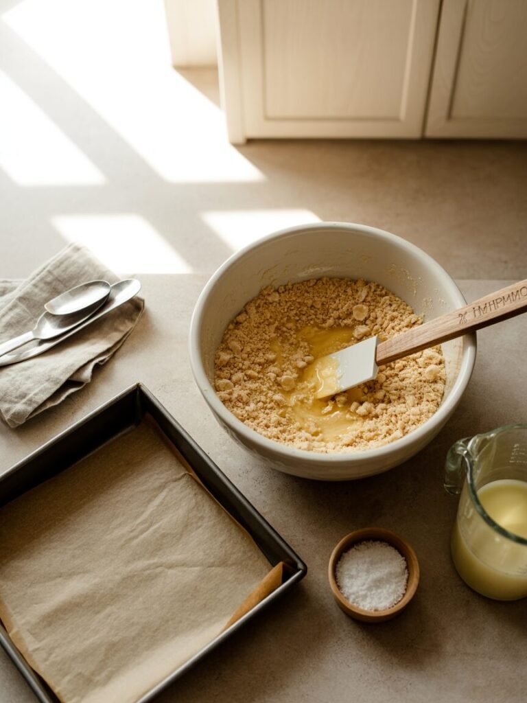 - Press firmly into lined pan with flat cup; compact corners. Bake 10 minutes until edges just deepen in color; crust smells toasty. Cool 5 minutes. Visual cue: surface looks set, not greasy‑wet.