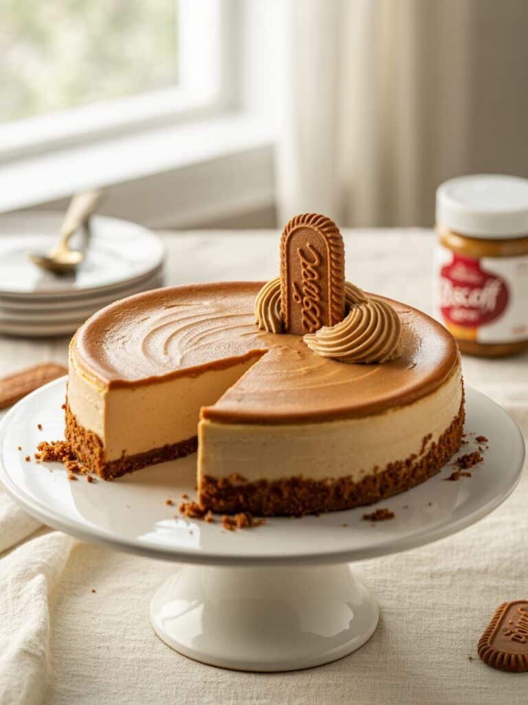 Present on a simple white cake stand with one slice pulled forward to showcase the creamy interior; optional light Biscoff drizzle and minimal crumbs around the base for realism.​