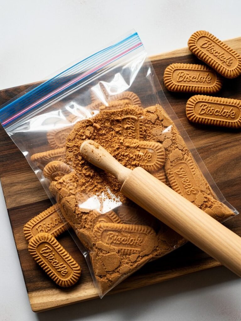 - Crush Biscoff cookies into fine crumbs (use a food processor or ziplock bag and rolling pin).