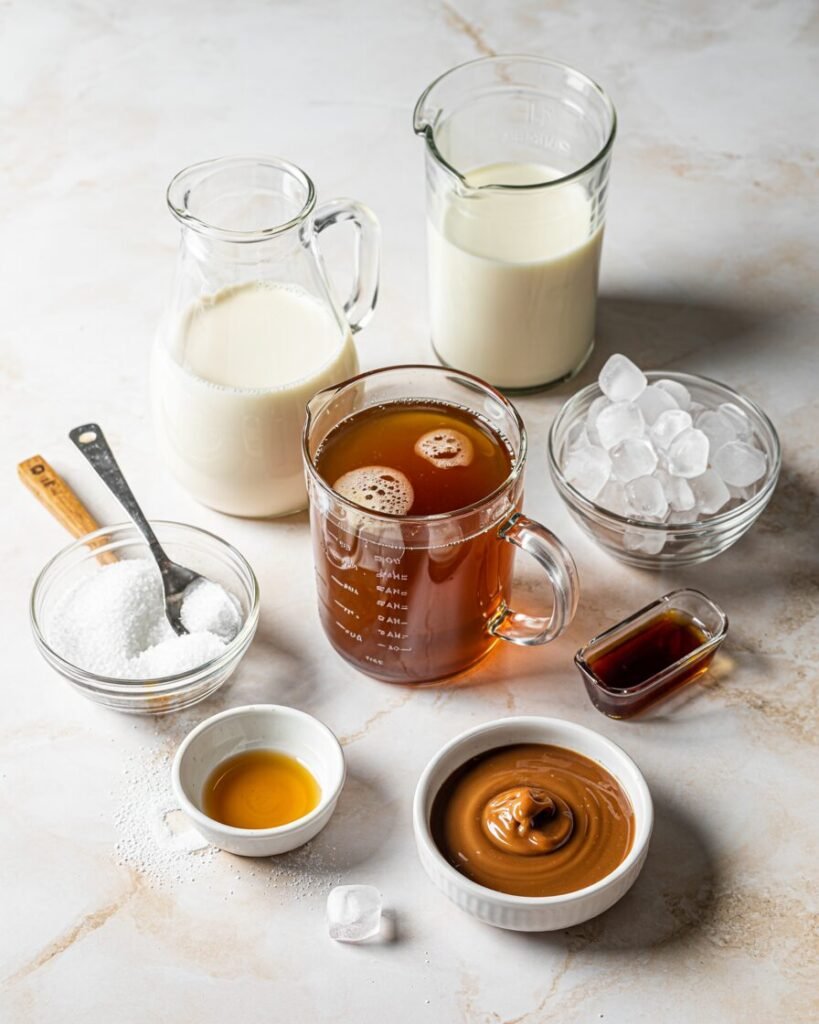 - Final version: Strong brewed coffee, cold whole milk and cream, cold ingredients, and a controlled caramel swirl. The result is smooth, rich, and truly shop‑wearing‑like.