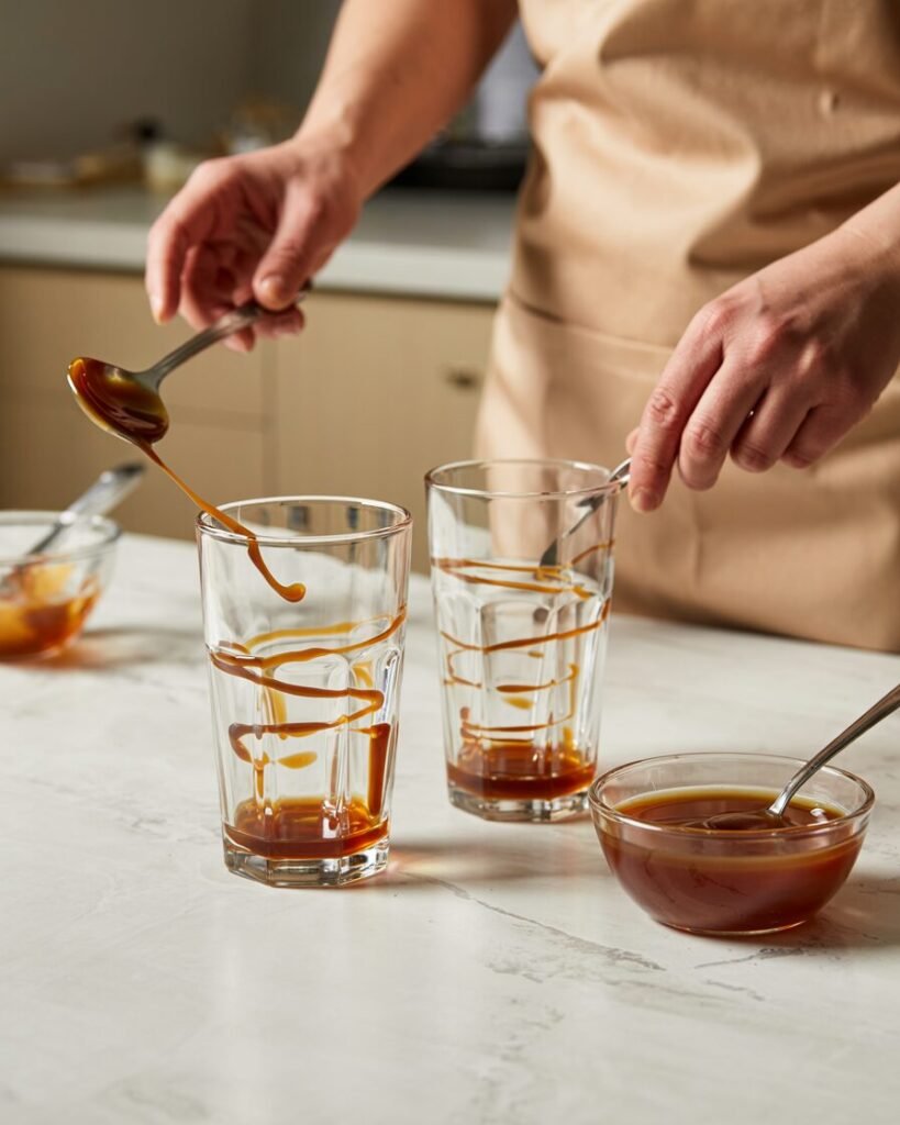 Pour 10 g (½ tbsp) of caramel into each glass. Use a spoon or small spatula to swirl it around the bottom and lower sides.