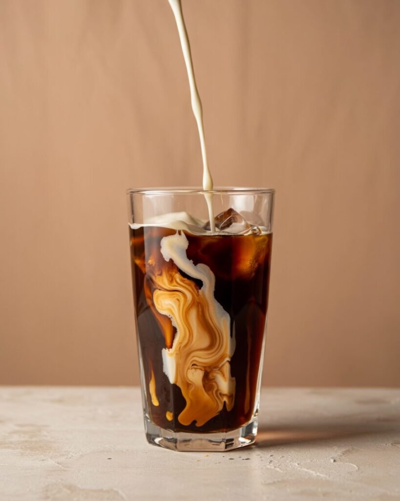 - Milk emulsification: Cold milk and coffee don’t mix easily. Adding milk slowly to coffee with a bit of syrup creates a silky texture. Optionally, a splash of cream increases mouthfeel because the fat coats the tongue and carries flavor.