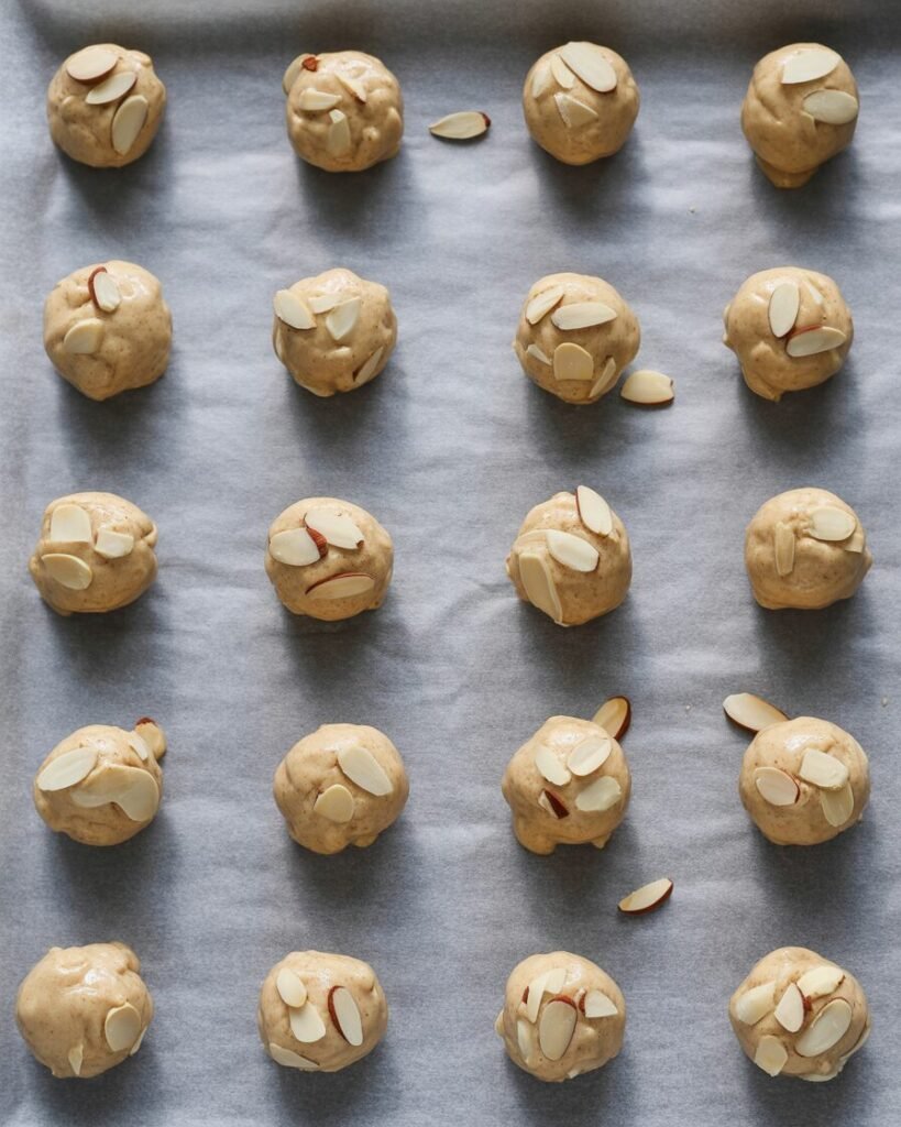 Scoop 1.5 tbsp balls and slightly flatten. Add sliced almonds if using.