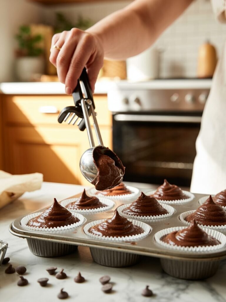 Visual cue: after resting, the batter will feel slightly thicker and may show a few small bubbles. - Fill the muffin cups
