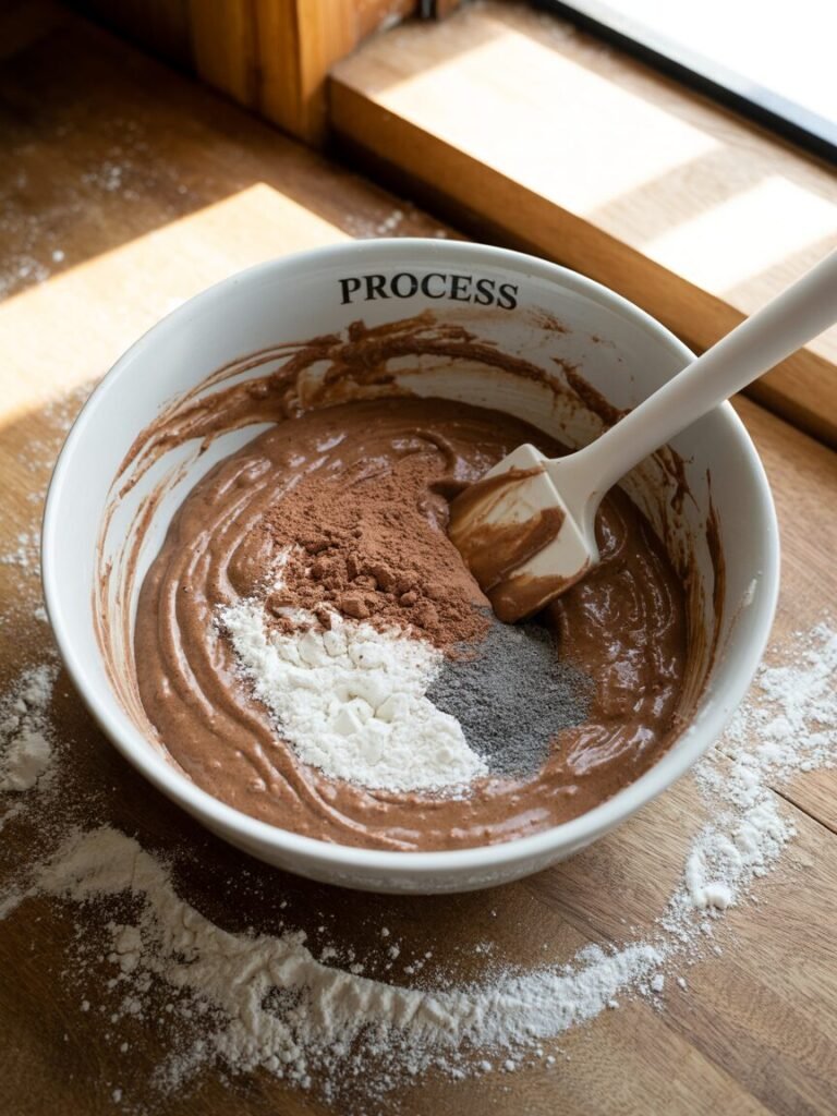 Visual cue: mixture should look cohesive and glossy, no visible streaks of egg or butter. - Combine dry ingredients