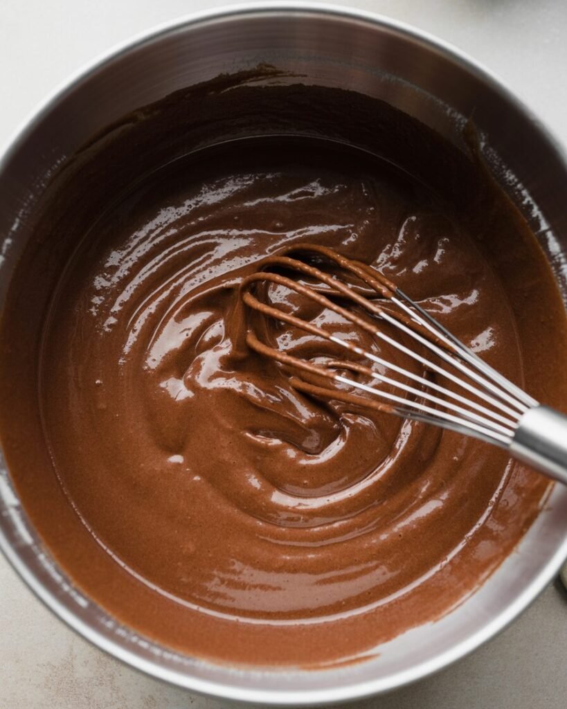 Visual cue: Cocoa should look evenly incorporated with no light streaks. - Add wet ingredients.