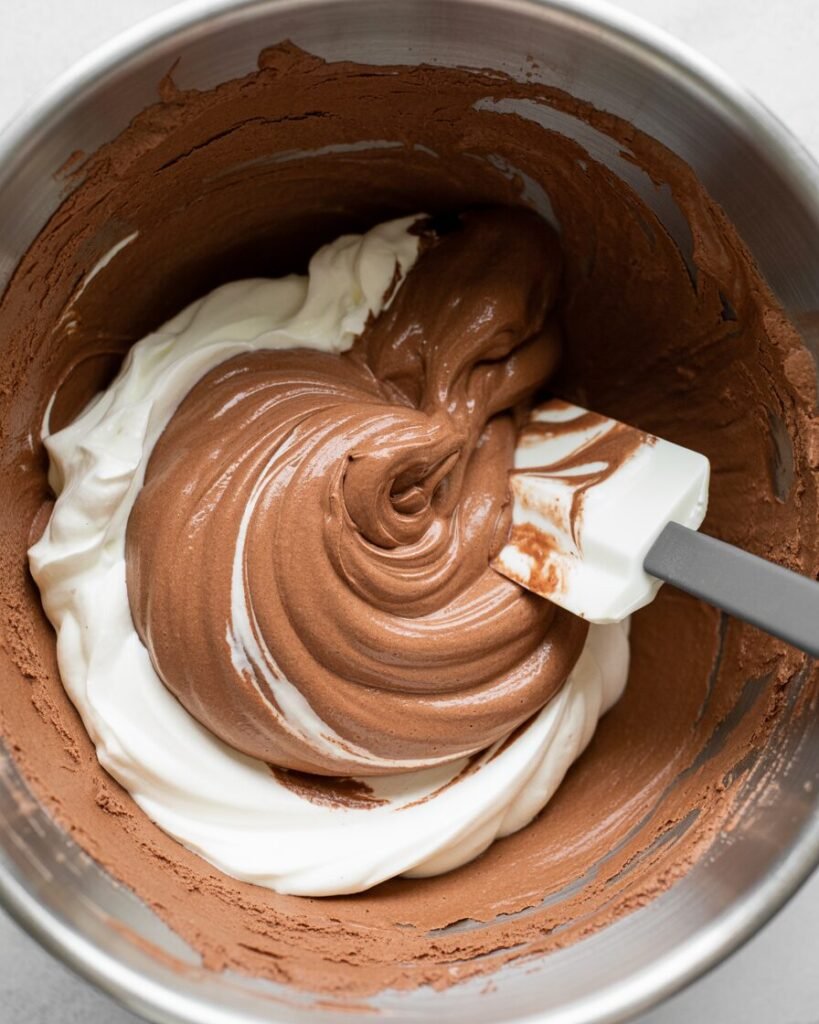 Visual cue: Peaks bend like a hook — not stiff, not runny. - Fold cream into chocolate.