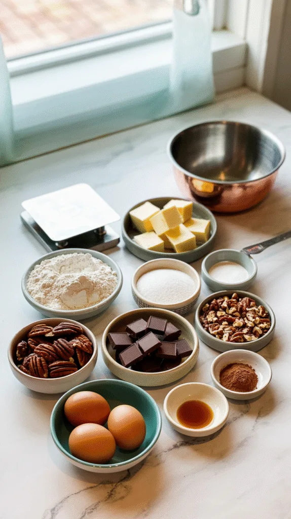 Spread pecans on a baking sheet and toast at 160°C (325°F) for 8–10 minutes until fragrant. Cool, chop (leave some halves for topping). - Melt Chocolate & Butter: