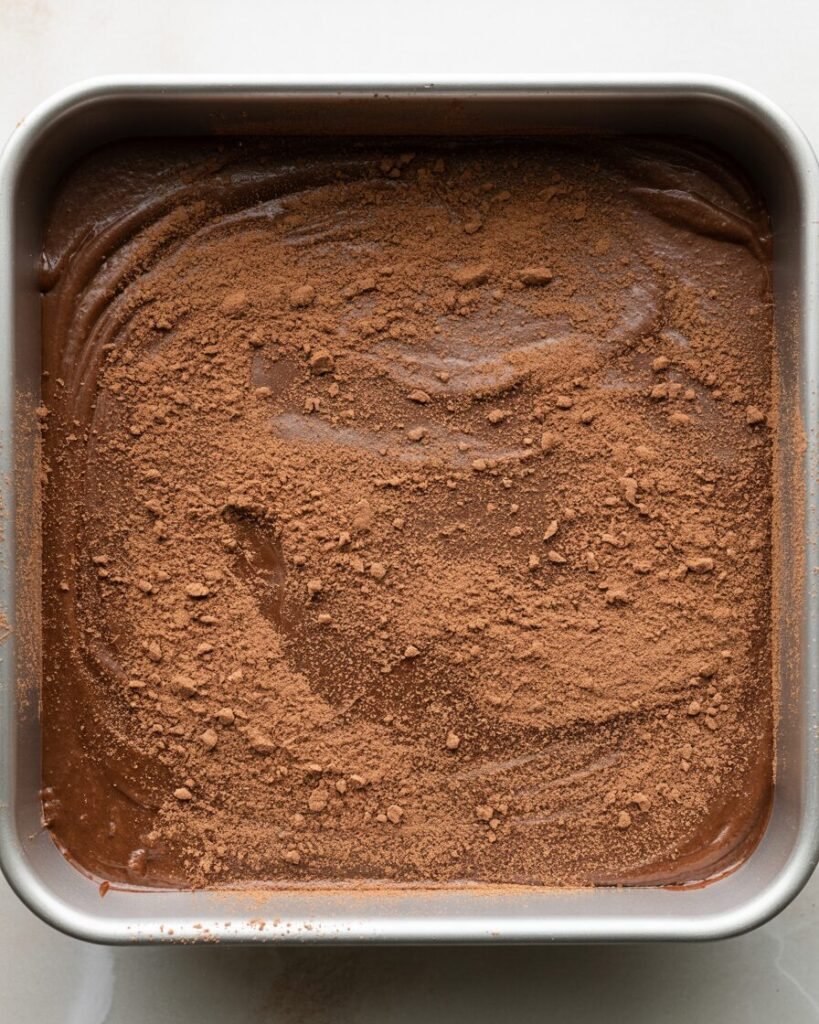 Stir brown sugar + 20 g cocoa together. Sprinkle evenly over batter.