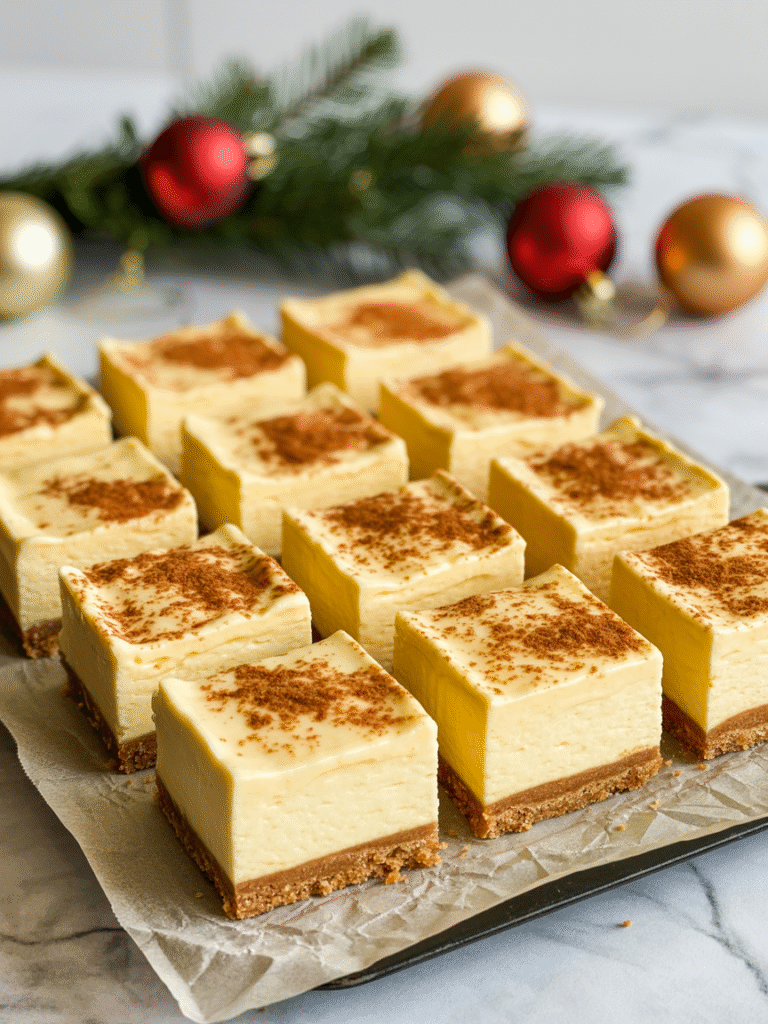 Eggnog isn’t just for drinking—it makes an incredible cheesecake filling too. These bars have a graham cracker crust, a creamy eggnog-flavored cheesecake layer, and a sprinkle of nutmeg on top for that classic holiday taste. They’re easier than making a full cheesecake but just as impressive.