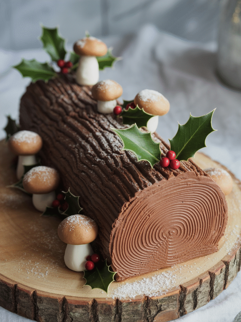 Decorate: Use a fork to create bark texture, add marzipan mushrooms, dust with powdered sugar, and chill before serving.