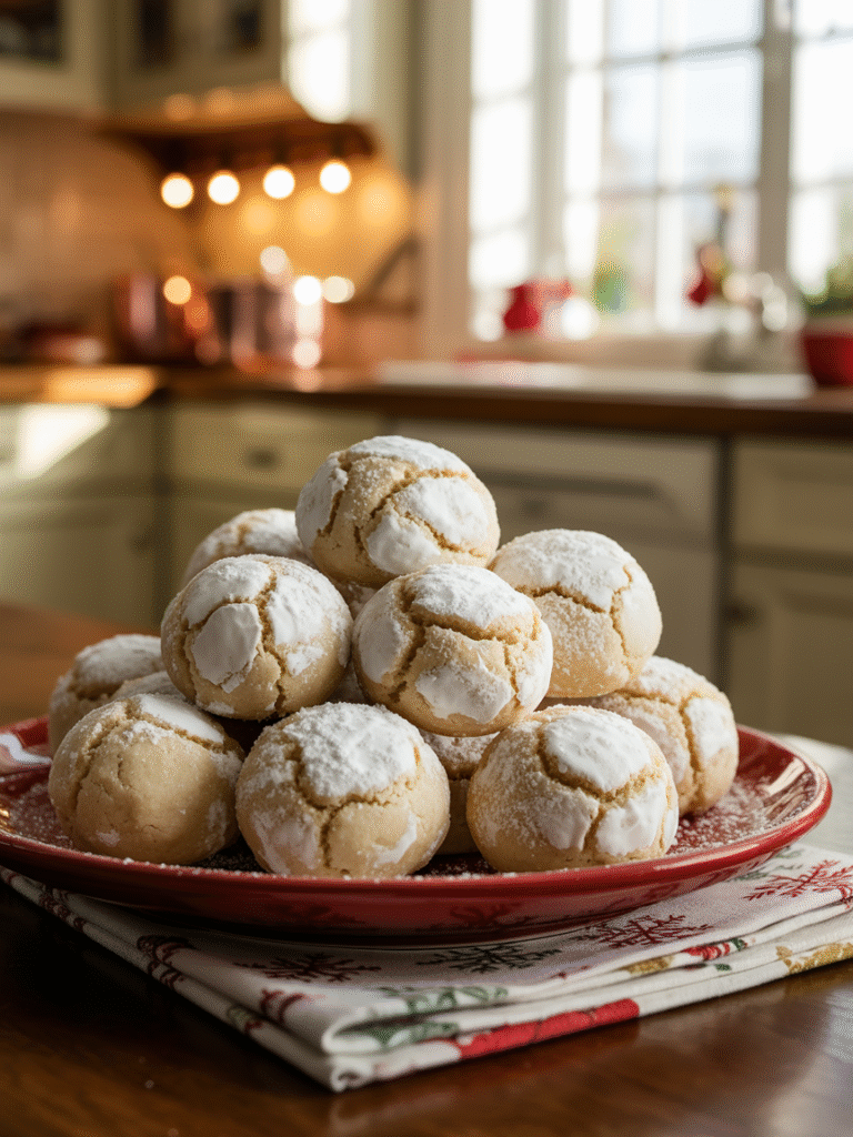 The dusting of powdered sugar on top makes them look like they’re covered in snow, which is just perfect for Christmas. These cookies are delicate and elegant—ideal for a fancy holiday tea or dessert table.