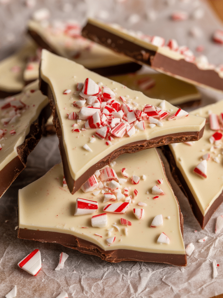If you want something that takes literally zero baking skills but still looks like you spent hours in the kitchen, peppermint bark is your best friend. This classic holiday treat combines dark chocolate, white chocolate, and crushed candy canes for a minty, crunchy, utterly addictive confection. It’s perfect for gifting, and kids absolutely love helping crush the candy canes.
