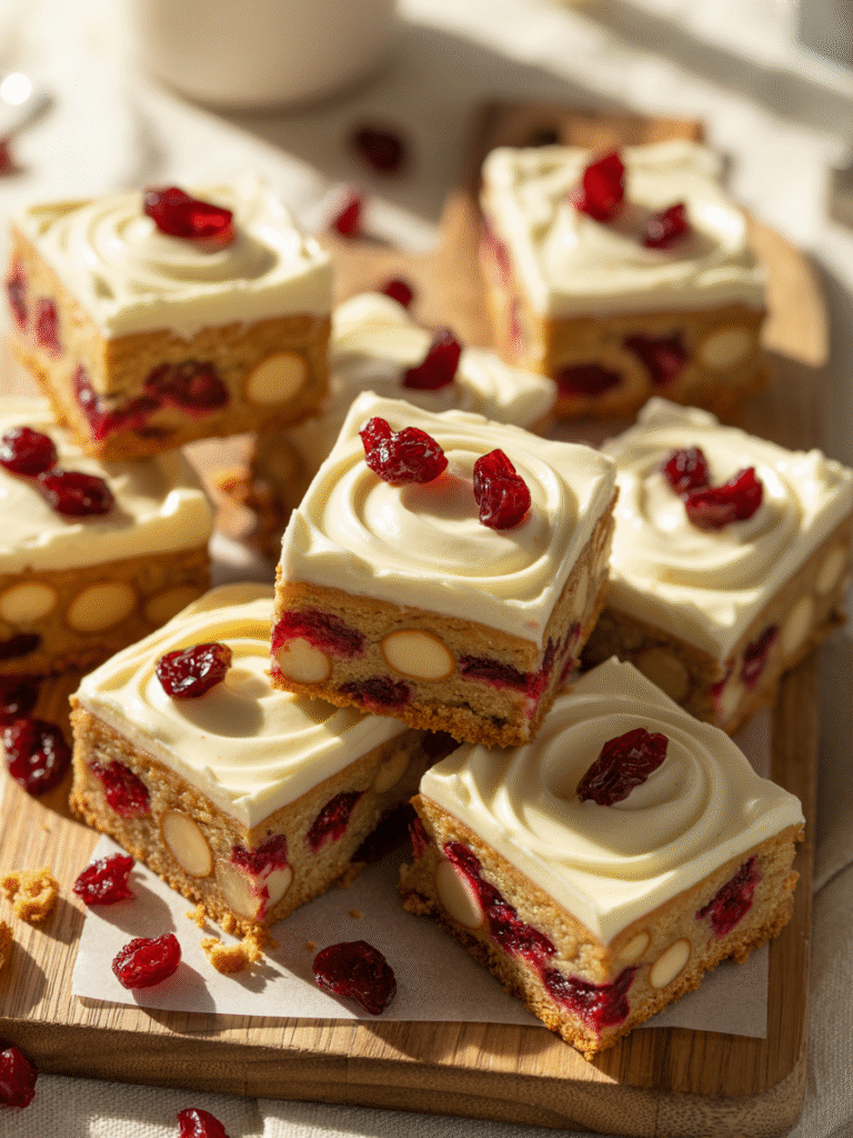 Frost and top: Spread frosting over cooled bars, sprinkle with chopped dried cranberries and white chocolate, then cut into squares.