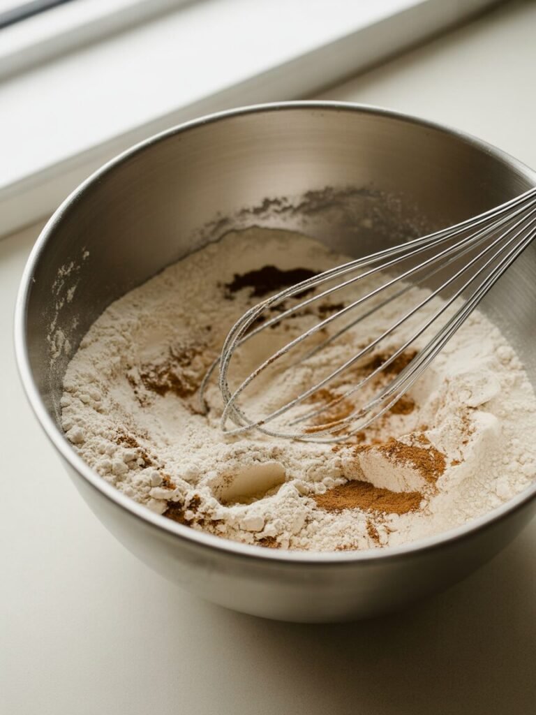 - Whisk Dry Ingredients:Â In a medium bowl, sift or whisk flour, baking powder, salt, and 1 tsp cinnamon. Set aside.