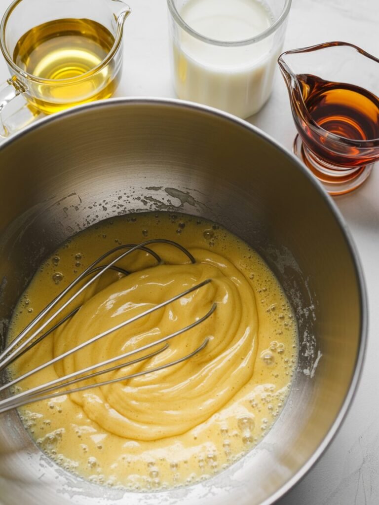 - Combine Batter:Â Add half the dry ingredients to the wet mix, whisk gently. Add the rest, whisk briefly until no dry streaks remain. Fold in the cooled melted butter until incorporated. The batter should be smooth and slightly loose, like a thin pancake batter.
