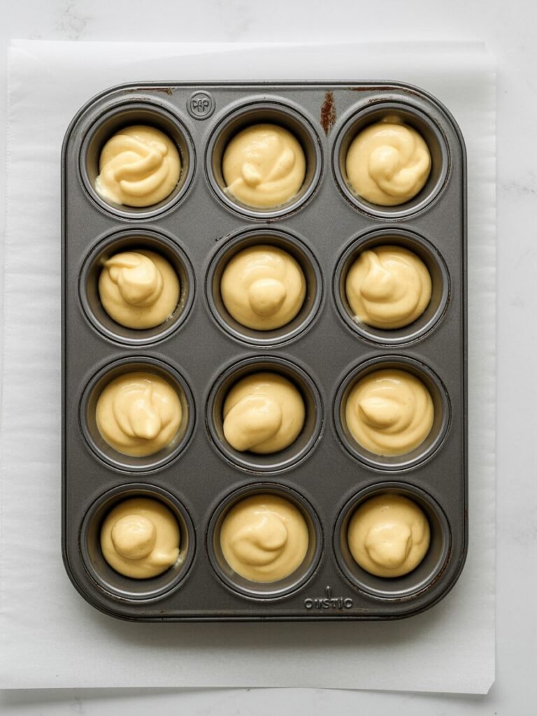 Bake: 12 minutes at 180°C (350°F). Muffins should be pale golden at the center, deep golden at the edges, and a skewer comes out clean. The sound will be light and crisp when tapped.