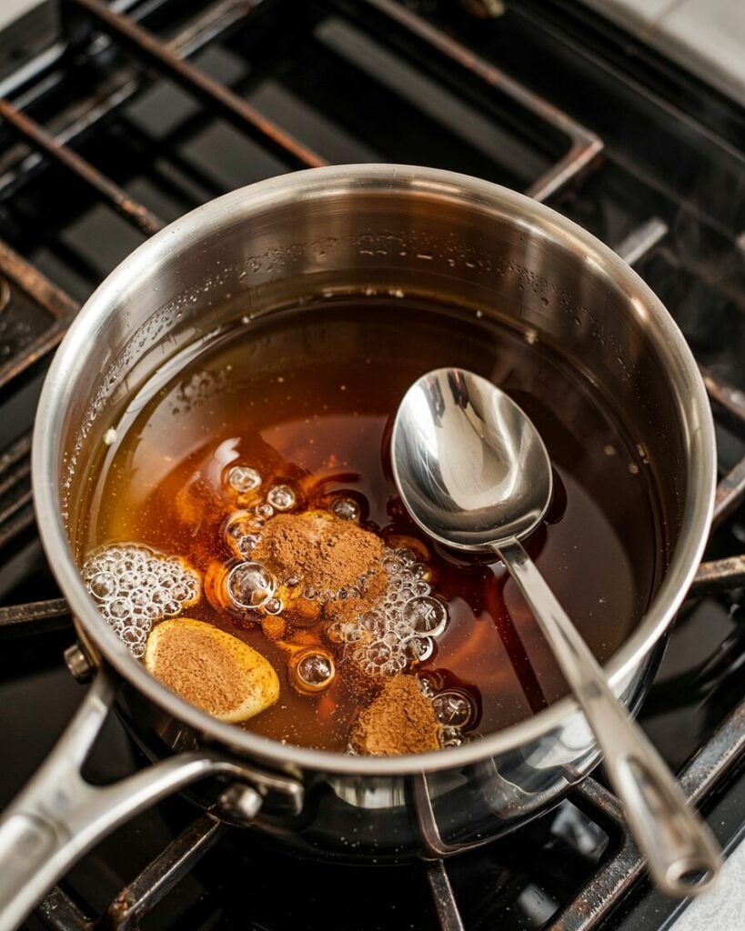 Visual cue: the syrup should look glossy and lightly thickened, not watery, with the cinnamon evenly suspended.