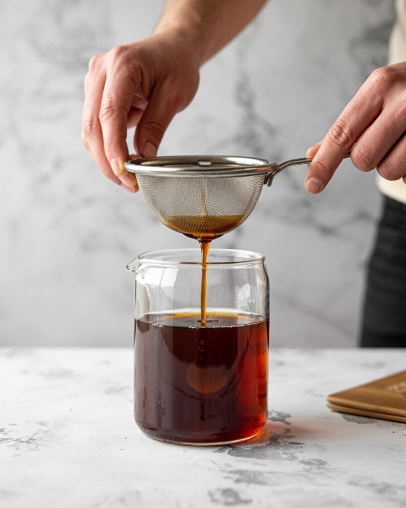 - Visual cue: Dark amber liquid forms; grounds settle at the bottom.