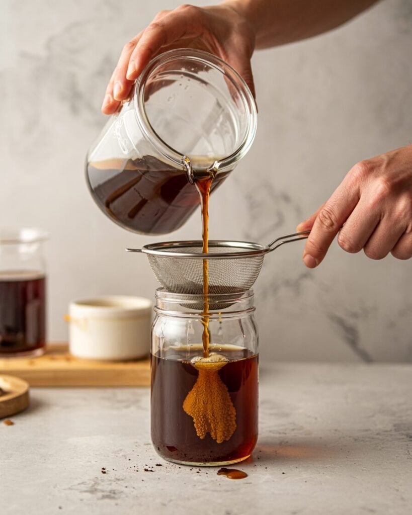 - Action: Use a fine-mesh sieve or cheesecloth to filter coffee into a clean jar or bottle. Press gently to extract liquid but avoid forcing grounds through.