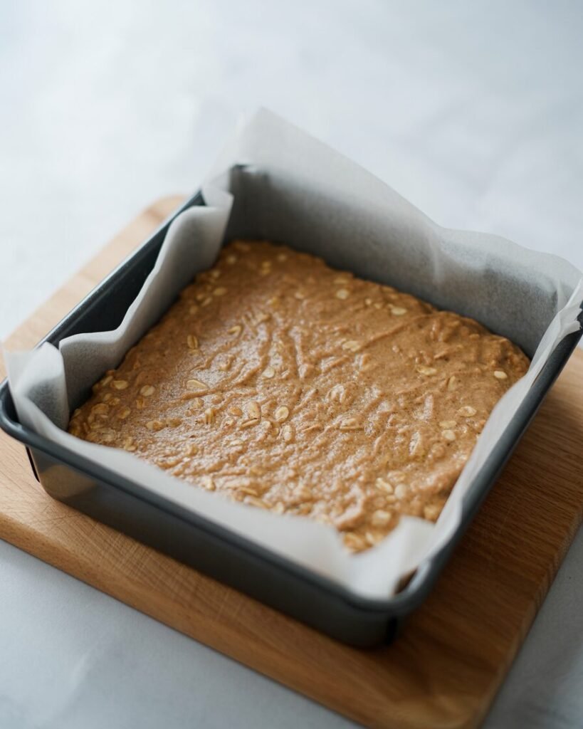 Transfer dough into the lined pan. Press firmly and evenly; smooth the top with an offset spatula.
