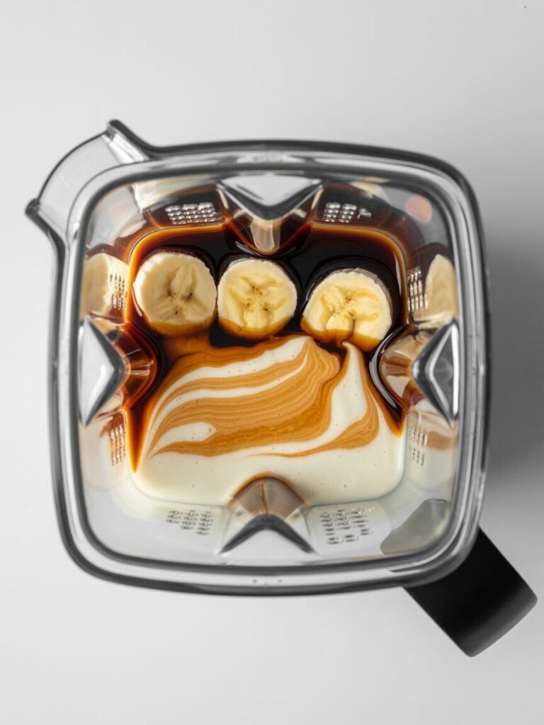 Step 3: Add ingredients in order: milk first, then yogurt, vanilla, coffee, frozen banana on top. This layering prevents banana from jamming blades. Blend on high 45–60 seconds. Visual cue: mixture should be completely smooth with no visible banana chunks, light tan color, and able to coat the back of a spoon thickly.
