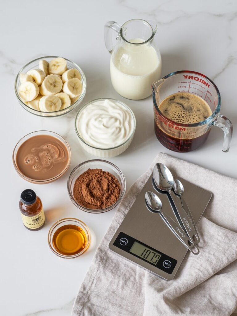 The frozen banana acts as both sweetener and thickener, creating a milkshake-like consistency without ice cream. Coffee (either cold brew or cooled espresso) provides caffeine and depth, while a splash of milk adds creaminess and helps blend everything smoothly. Greek yogurt adds protein and creates body—it also tempers coffee’s acidity, preventing that harsh bite you sometimes get in blended coffee drinks. The small amount of vanilla extract rounds out the flavors and masks any “green” banana notes if your fruit isn’t perfectly ripe.