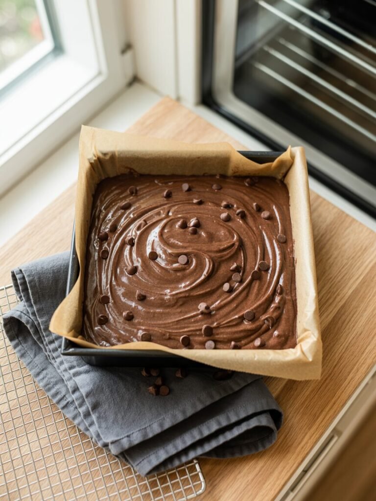 - Fold in chocolate chips. Pour batter into the prepared pan and smooth the top.