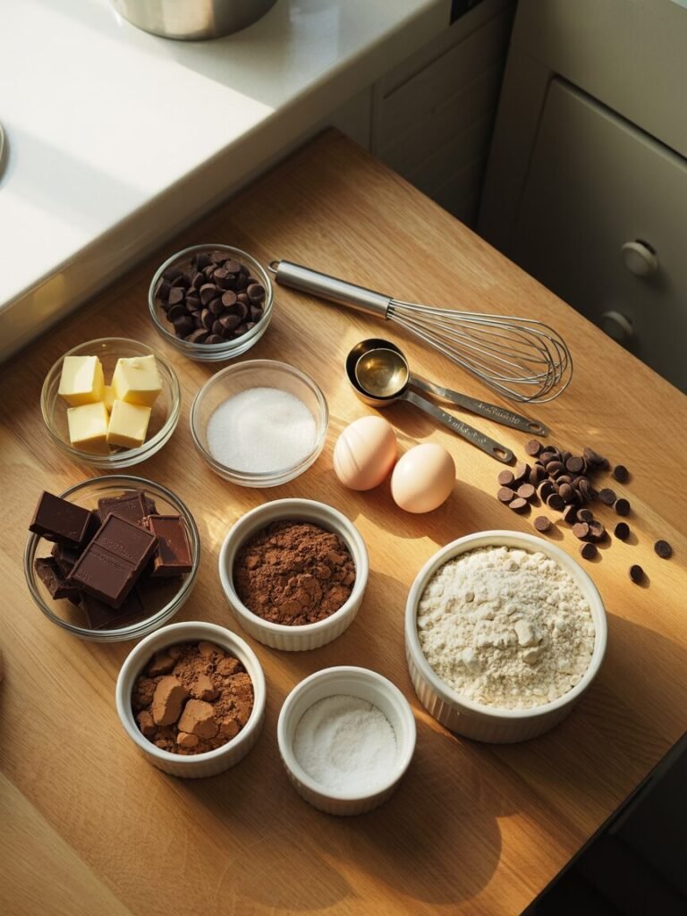 Purpose: Butter and chocolate add richness and fudginess; sugar gives structure and crackle; eggs and vanilla add flavor and emulsification; flour gives structure; baking powder ensures a slight rise; chocolate chips boost flavor and texture.