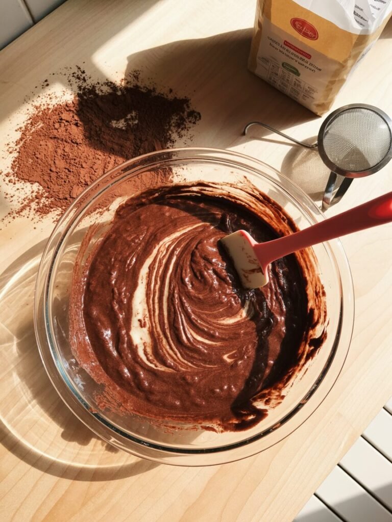 - Sift in flour, cocoa, baking powder, and salt. Fold in gently with a spatula until just combined.