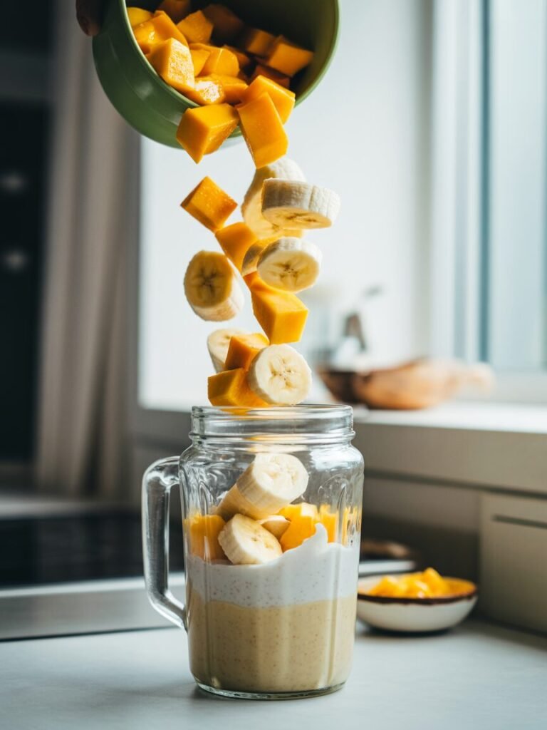 Step 2: Add fresh mango cubes and frozen banana slices. Blend on medium 30 seconds, then high 45 seconds, stopping to scrape sides. Checkpoint: Batter ribbons off blade for 3-5 seconds (like soft-serve); feels smooth when rubbed between fingers. If gritty, blend 15 seconds more.