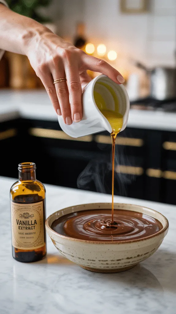 Stir in melted butter and vanilla (plus optional coffee pinch) until fully incorporated. - Combine (2–3 minutes)