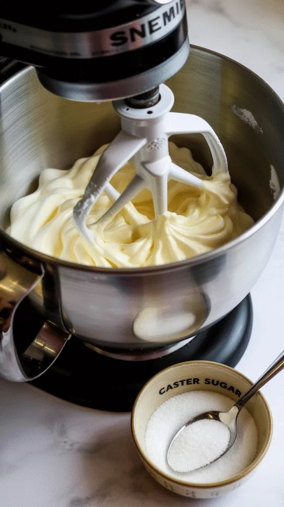 - Continue whipping until stiff peaks form. Visual cue: peaks should stand straight with a sharp point, glossy not grainy. If it clumps, you’ve over-whipped.
