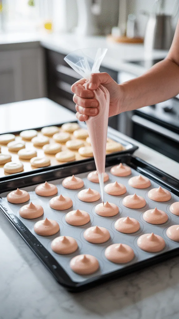 Pipe 3–4 cm circles. Tap tray 3–4 times. Rest until shells are matte and dry to the touch. - Bake (15–18 min at 150°C / 300°F):