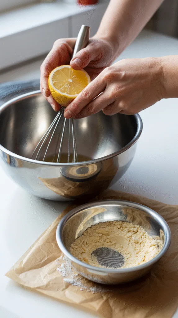 Wipe bowls with vinegar to remove grease. Sift almond flour + icing sugar twice until fine - Whip Meringue (10–12 min):