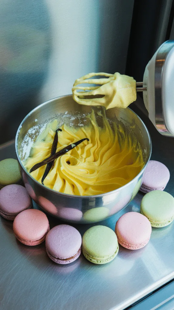 Preheat oven 15 min. Bake one tray in center rack. Doneness: shells have risen feet, tops don’t wobble. Cool fully before filling. - Buttercream (10 min):