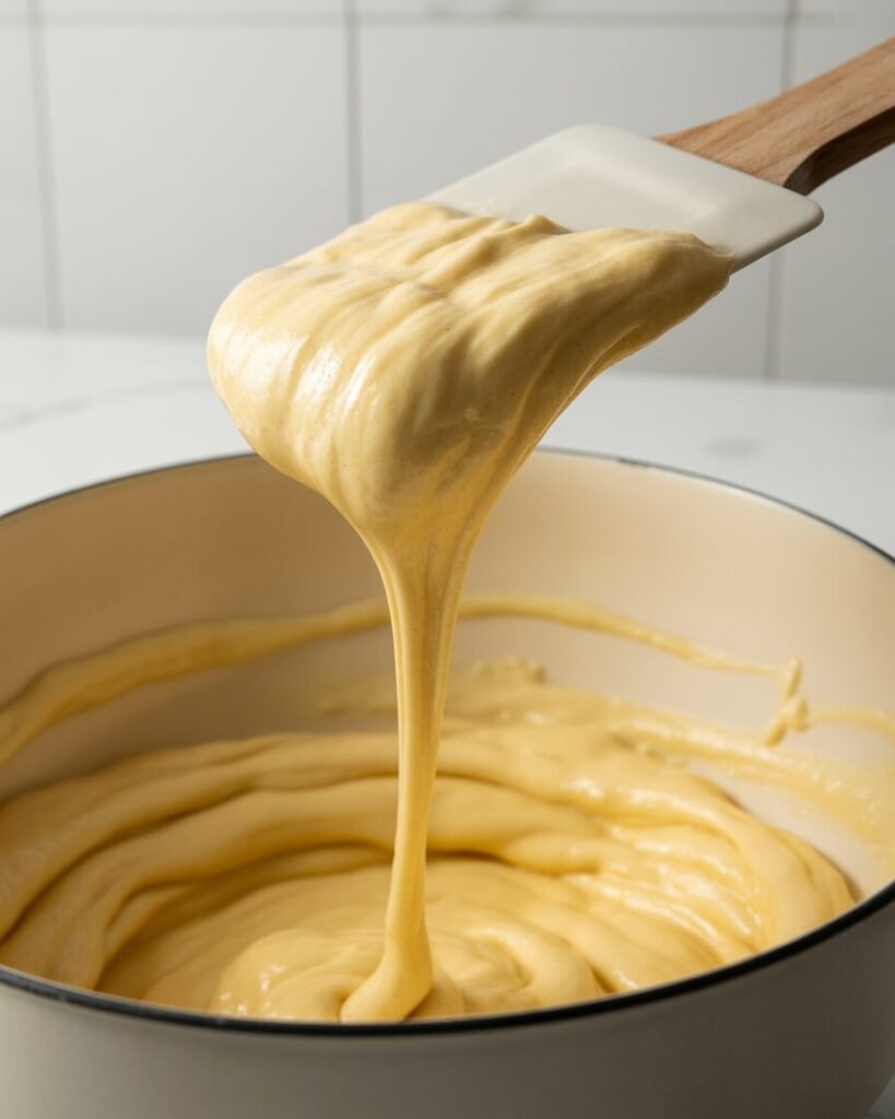 Eggs are the backbone: their proteins set and create the hollow interior we fill later. Adding them one at a time ensures the dough reaches the correct “V-shaped ribbon” consistency—not too thick, not too runny. Room-temperature eggs mix in faster, preventing overworking.