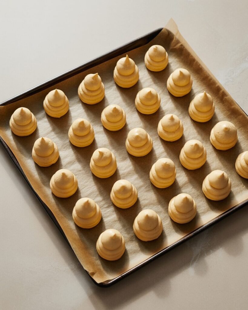 Pipe 1½-inch mounds onto parchment, spacing 2 inches apart. Smooth peaks with a damp fingertip.