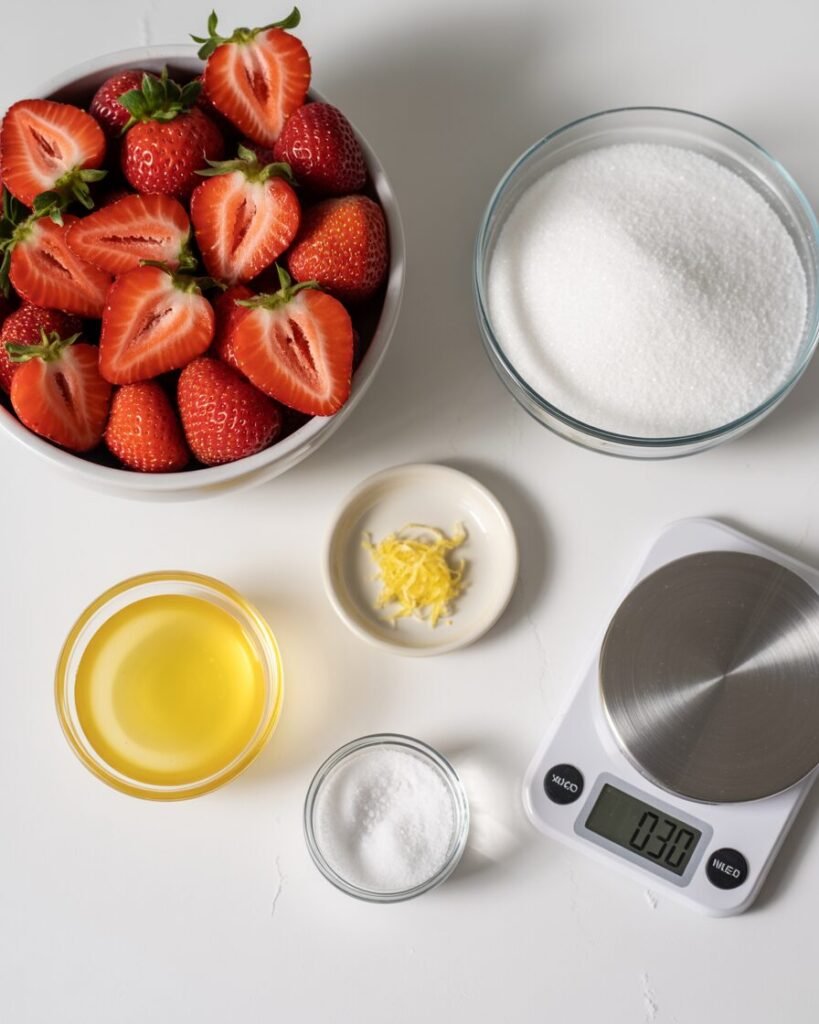 This jam uses natural pectin from strawberries and lemon juice. When heated to 104–105°C (219–221°F), pectin fibers bond with sugar and acid to create a soft gel—no powdered pectin needed. The balance between sugar and fruit is also intentional: too little sugar prevents thickening, while too much causes crystallization and an overly firm set.