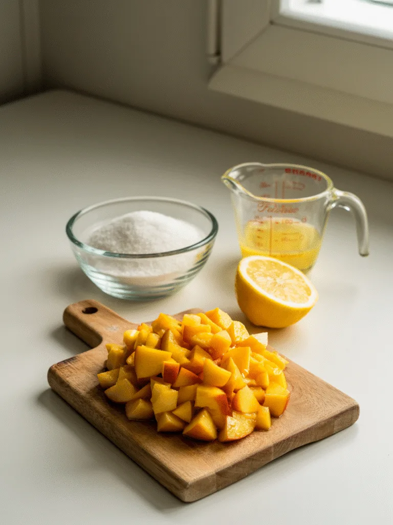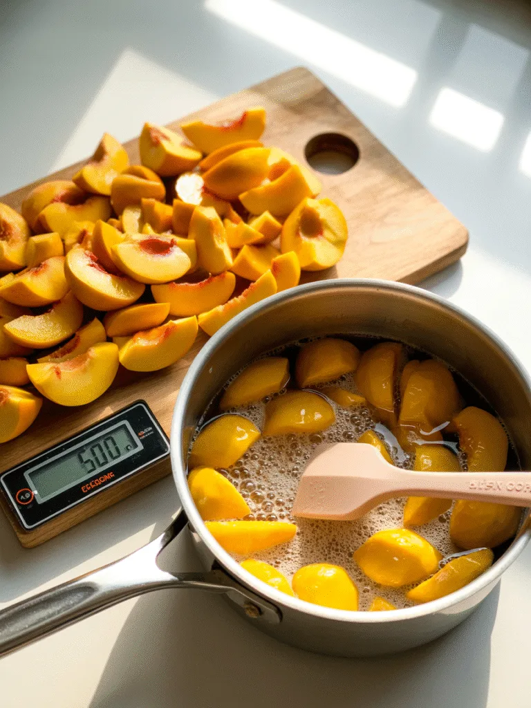 Peel, pit, and chop 500g of peaches into 1cm pieces. Weigh them for accuracy. Place in the saucepan with sugar and lemon juice. Stir gently, then let macerate for 30 minutes. The mixture should look wet and syrupy, not dry.