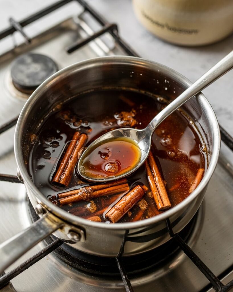 Combine the water, brown sugar, granulated sugar, cinnamon sticks, ground cinnamon, and salt in a small saucepan. Bring to a gentle simmer over medium heat, stirring until the sugar fully dissolves, then simmer 8–10 minutes until slightly thickened; similar cinnamon syrup methods use a short simmer plus steeping time for fuller flavor. Visual cue: the syrup should look glossy and lightly translucent, not muddy or grainy.