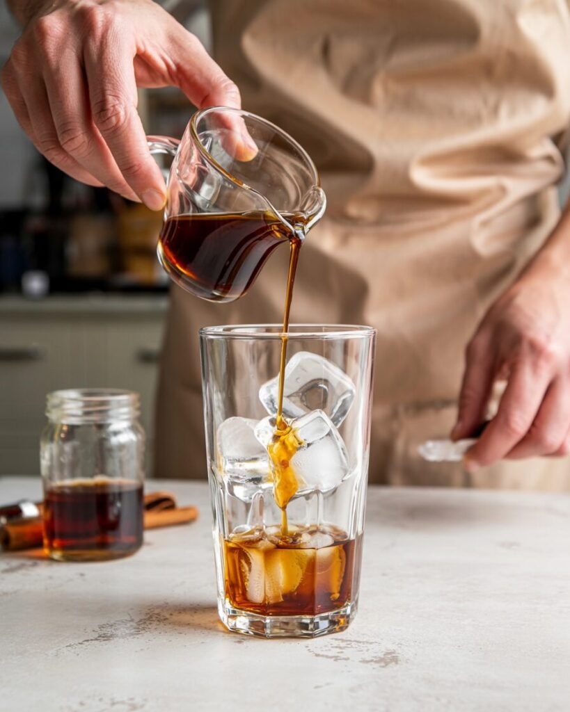 Add 20–30 ml syrup to the bottom of a 16 oz glass, then pour the hot espresso over it and stir. This helps the syrup dissolve fully before the ice goes in, a common approach in homemade iced cinnamon dolce latte recipes. Checkpoint: the mixture should smell like cinnamon toast and coffee together, with no spice clumps at the bottom.