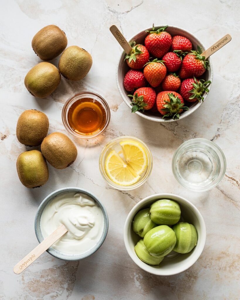 Kiwi is naturally acidic, which enhances the sweetness of strawberries. Adding a small squeeze of lemon juice helps prevent dull color and keeps the flavor vibrant after freezing.